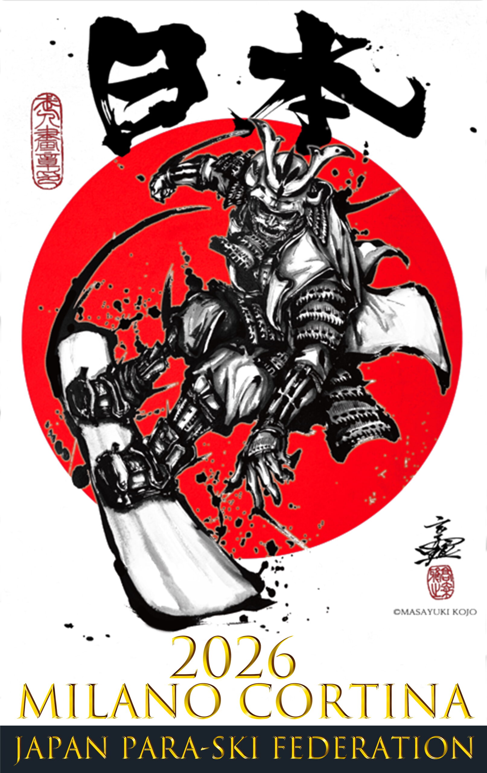 日の丸を背にした武人(武人画師 こうじょう雅之氏制作:https://www.macfamily57.com/)を中央に配し「日本」の文字と開催場所の「2026 Milano Corina」と言う文字を配したデザインになっています。